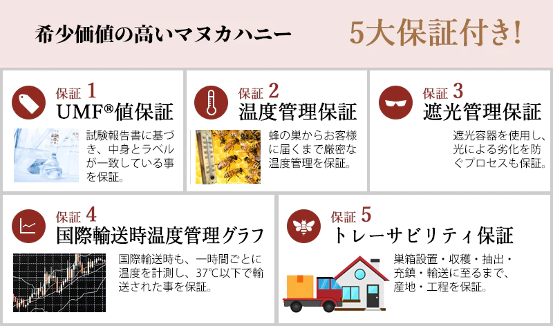 世界基準のUMF®認定はもちろん、国際輸送時温度管理も含めた『5大保証』を付けて日本の皆様に最高品質でお届けします。